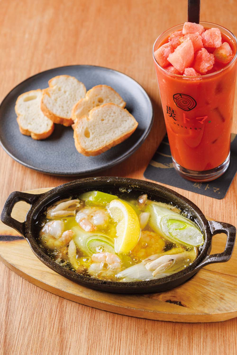 イタリアンのシェフと和食の料理人が腕をふるう店の看板は、特製トマトソースと3種のピリ辛合わせ味噌が効いたハイブリッド鍋。中央にこんもりと鎮座するトマトがスープにほどよく溶け込んだら、さぁ食べごろ。たっぷりの野菜やキノコ、備長炭で炙(あぶ)った地鶏肉やつみれが、ほんのり甘みとコクのあるピリ辛スープにからみ、口中に旨味があふれ出す。思わずスープを飲み干したくなるが、しばしの我慢を。炭トマならではの鍋の締め、とろーり熱々チーズリゾットが待っている。合いの手に炭火焼き鳥をはさみつつ、最後の一滴まで楽しみ尽くそう。