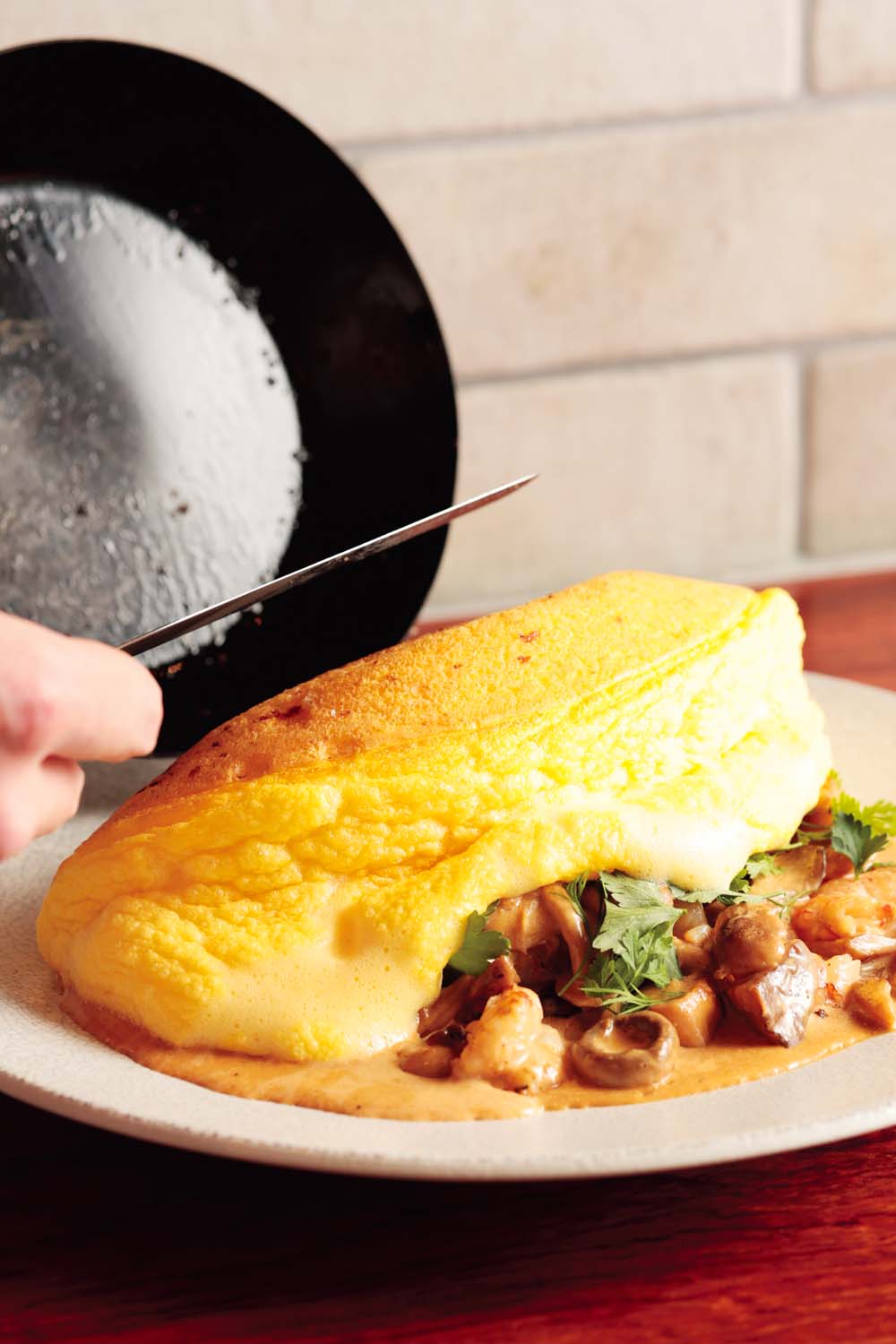 本格フレンチをアラカルトで。名物はバターとフルールドセル(塩の花)をひいたフライパンで香ばしく、ふんわり焼き上げたスフレオムレツ。エビの殻で取った出汁に生クリームとキノコを加えたソースでどうぞ。ワインは産地にこだわらず、ナチュール系を20種類ほどセレクト。料理はどれもボリュームたっぷりだが、メニューによってハーフサイズも対応。