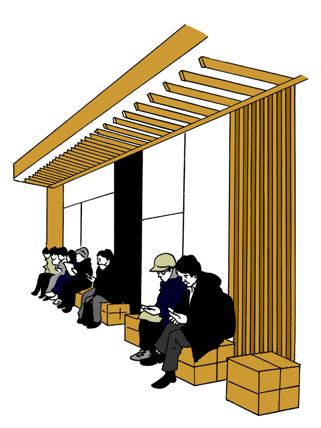 ペデストリアンデッキ自体にもベンチが設置されているため、天候のいい時などは座って待つこともできる。