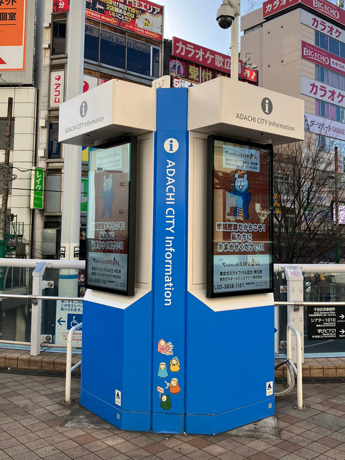 このペデストリアンデッキを見渡してみると、足立区のインフォメーションデジタルサイネージ、