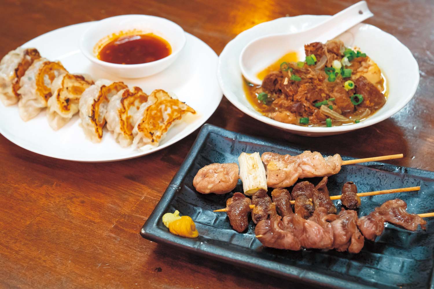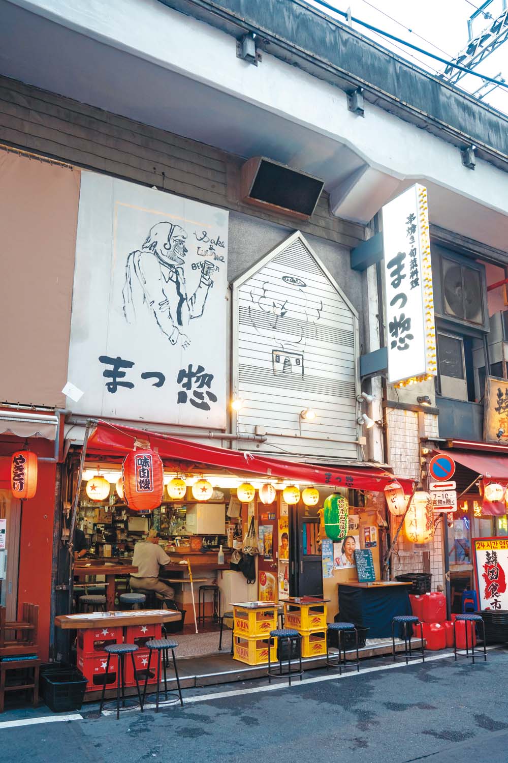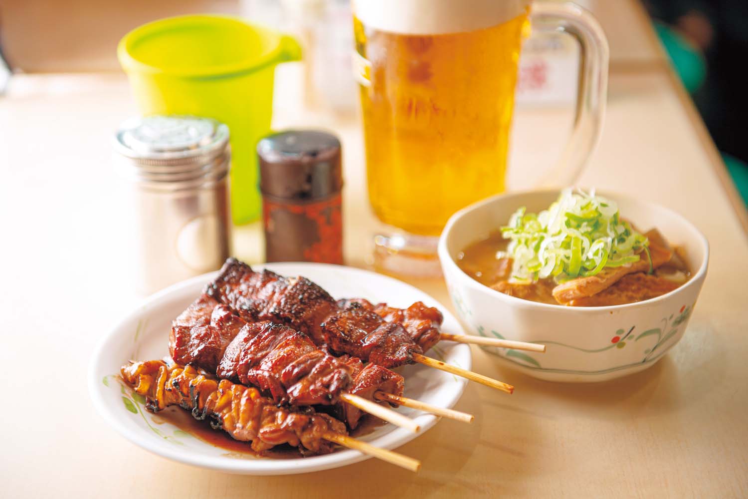 ガード下で、真っ昼間からもくもく煙を上げる老舗『登運とん』は1953年創業。備長炭で焼くもつ串は、ふっくらやわらかく1本210円(1種類2本~の注文)。一人飲みには5串盛りがおすすめ。天井や壁の写真やポスターはまさに昭和の風情、ガタンゴトンと真上を走る電車の音をBGMに味わうビールは格別。平日昼でも常連客や訪日旅行者で席はすぐに埋まる人気ぶりだ。