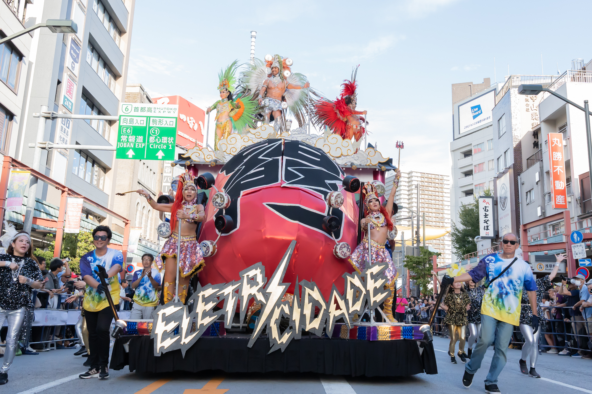 見どころはなんといっても華やかなパレード。当日は馬道通りから雷門通りまでの約800mを、全国から集まった実力派チームがエネルギッシュなパフォーマンスで魅了する。色とりどりの衣装を身にまとい躍動感たっぷりに踊るダンサーはもちろん、サンバのリズムを奏でるバテリア(打楽器)隊、各チームのテーマに沿って装飾されたアレゴリア(山車)など見どころがいっぱいだ。