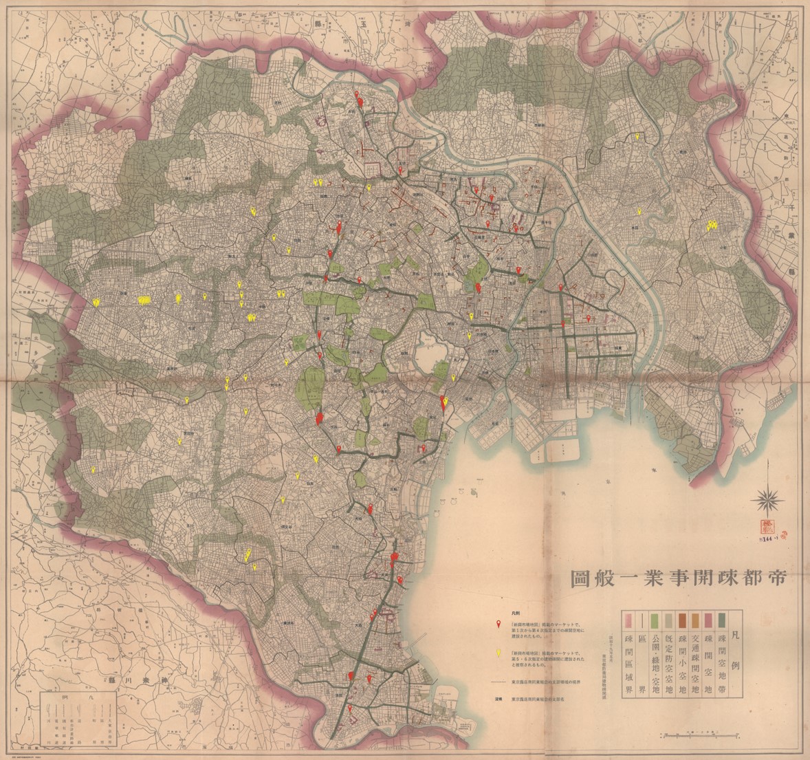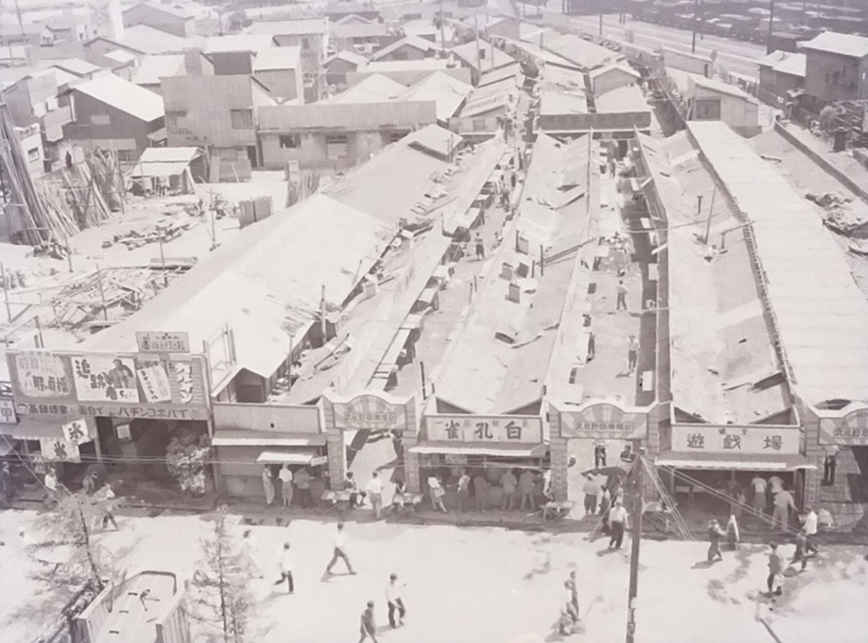 戦中、空襲による延焼を防ぐために実施された「建物疎開」は、住宅密集地の家屋を強制的に解体撤去し、空地を⽣み出した。この空地や戦争の焼け跡、路上などは、戦後の混乱期に暫定的・時限的に仮設の市場へと変貌。いわゆる闇市となり、その後役割を終えて徐々に姿を消していった。