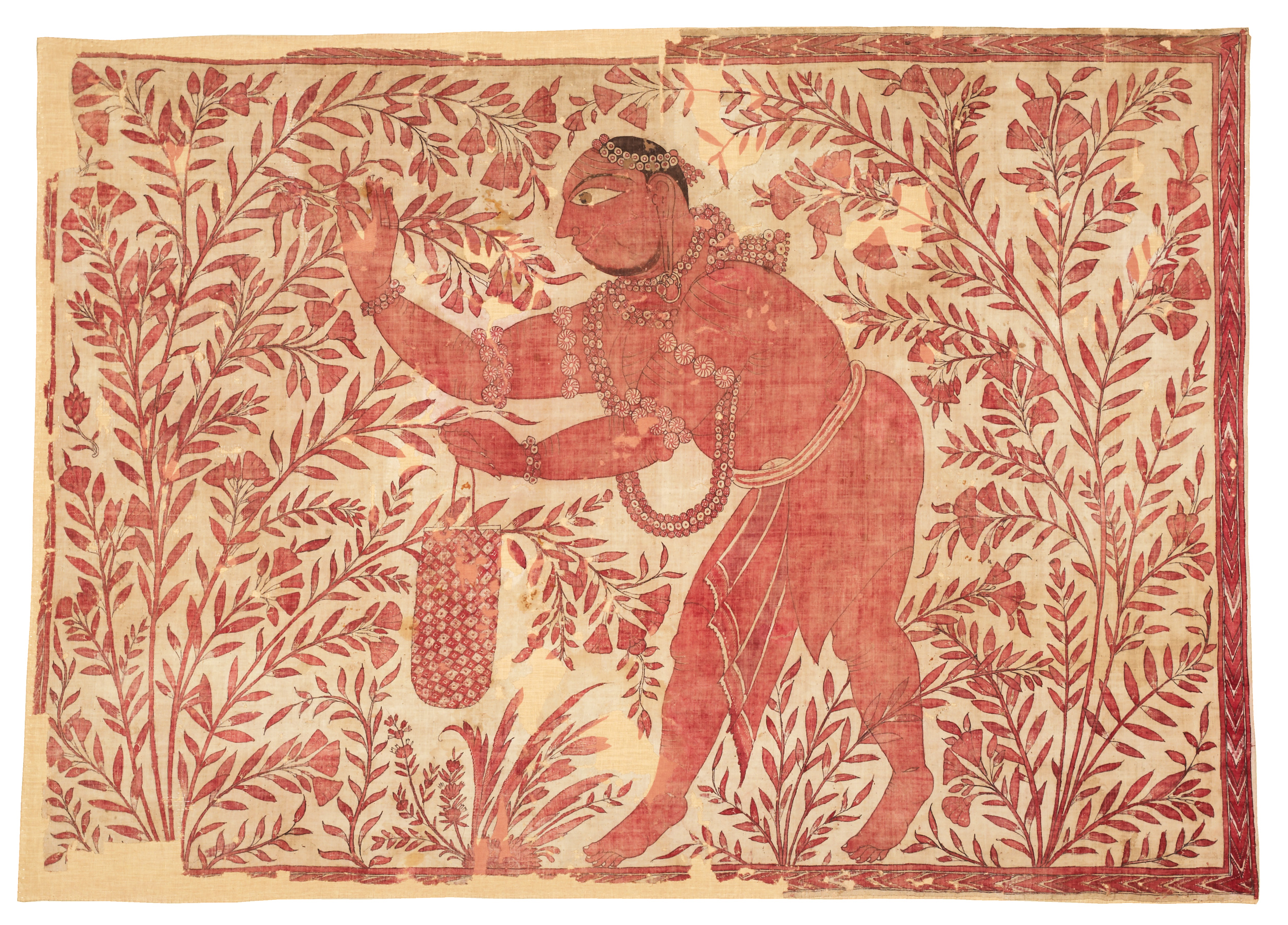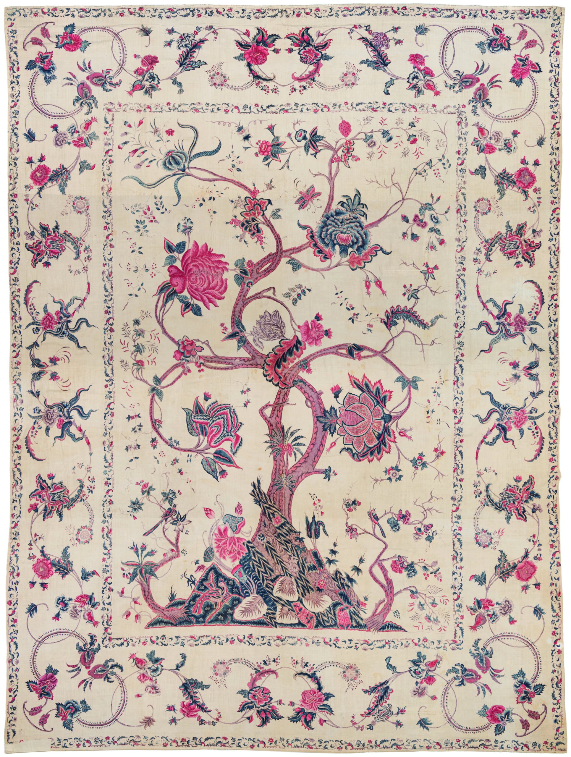数千年の歴史の中で、衣服や宗教儀式、室内装飾など、さまざまな用途に使われてきたインド更紗。天然素材の茜と藍を巧みに用い、染織の難しい木綿布を色鮮やかに染め上げて作られた更紗は、主要な交易品として1世紀には東南アジアやアフリカへ渡り、17世紀にはヨーロッパ各国で相次いだ東インド会社の設立に伴い世界中へと輸出された。貿易を通して他国の要望に応じたデザインを展開しつつも、力強いインドの美意識が内包されたインド更紗は、世界中のあらゆる芸術に影響を与えたという。