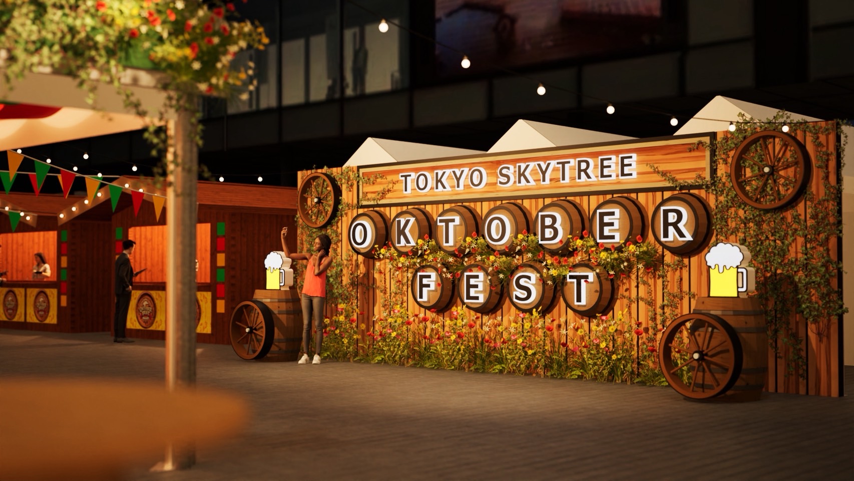 また会場内には、ビール樽をモチーフにしたフォトスポットも登場。ビール樽を組み合わせた「OKTOBER FEST」のロゴの前で昼間は青空とスカイツリーを背景に、夜はライトアップの光に包まれて、グラスを掲げて乾杯するなどバリエーションもさまざまに撮影を楽しめる。