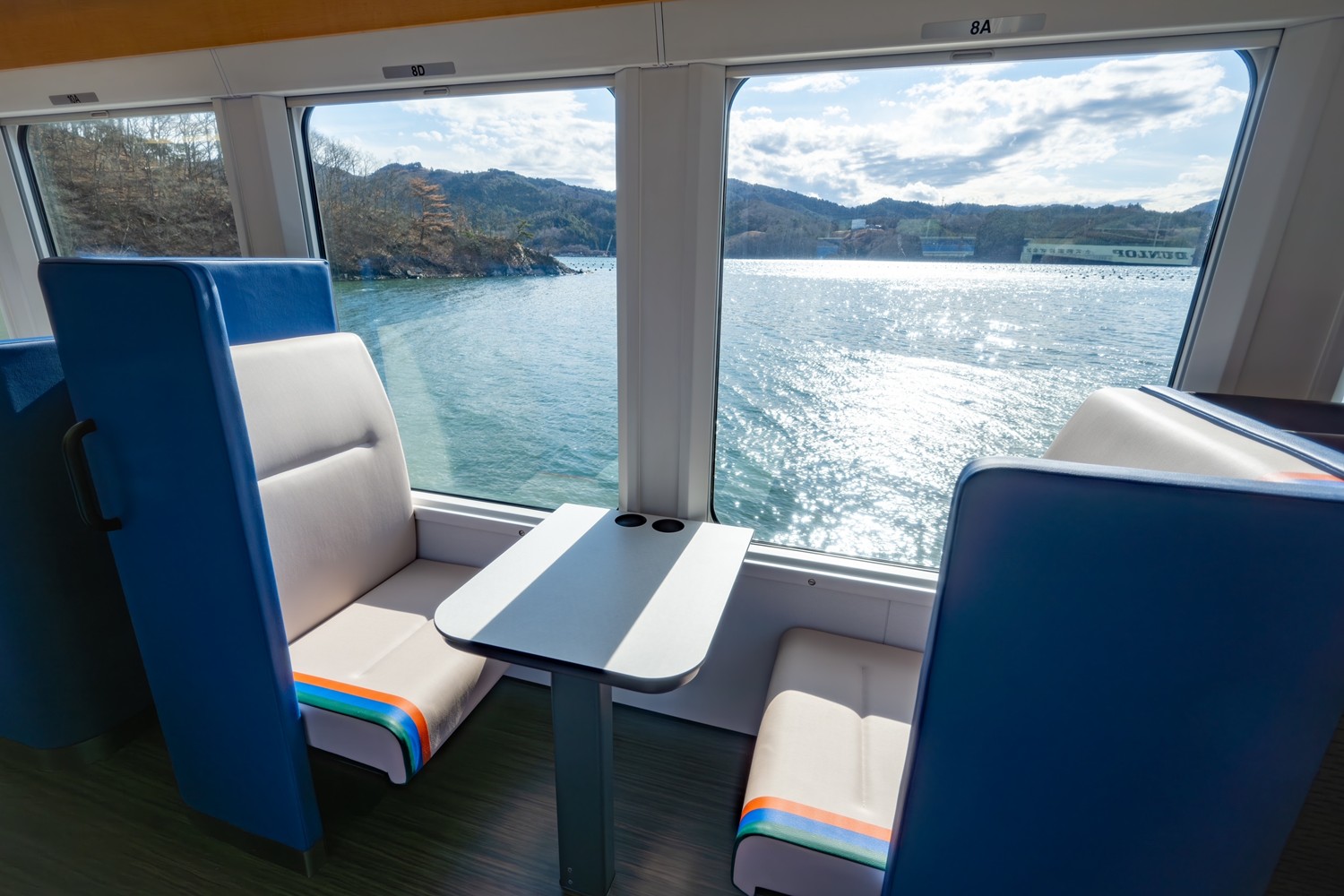車内放送では、遠藤正明さん、小松準弥さん、伊達さゆりさん、安野希世乃さん、山寺宏一さんといった宮城県ゆかりの歌手や声優の方々による沿線案内も! 車窓からの景色とともに、その土地の魅力や歴史まで知ることができ、旅気分をいっそう高めてくれる。