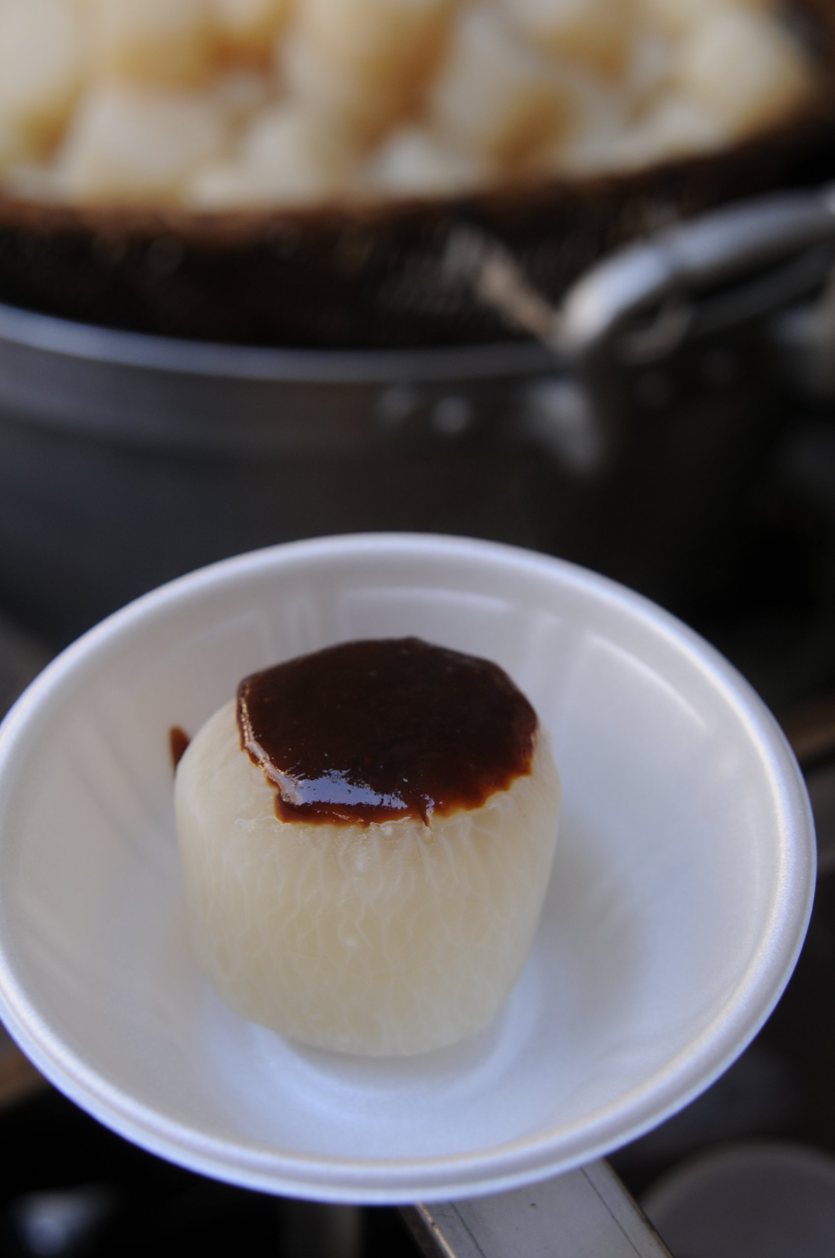 当日は11時から法要が行われ、法要終了後に風呂吹き大根がお神酒とともに参拝者に振る舞われる。これは正月に供えられた大根を炊き上げたもので、アツアツの大根に特製のゆず味噌がたっぷりとかけられる。「前々日から準備を始めて、丁寧に調理しています。お祭りが始まった当初、あちこちの料亭の味を研究してレシピを完成させたと聞いております。味の評判もいいんですよ」と教えてくれたのは待乳山本龍院の深谷昌広さん。