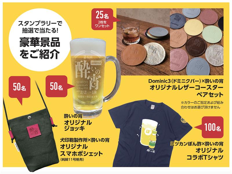 「酔いの宵」特製ビールジョッキをはじめ、職人による質実剛健な帆布鞄をつくる浅草「犬印鞄製作所」のスマホポシェットなどが用意されている。スタンプラリーの参加ル―ルは、「参加店一覧マップ」を参照。