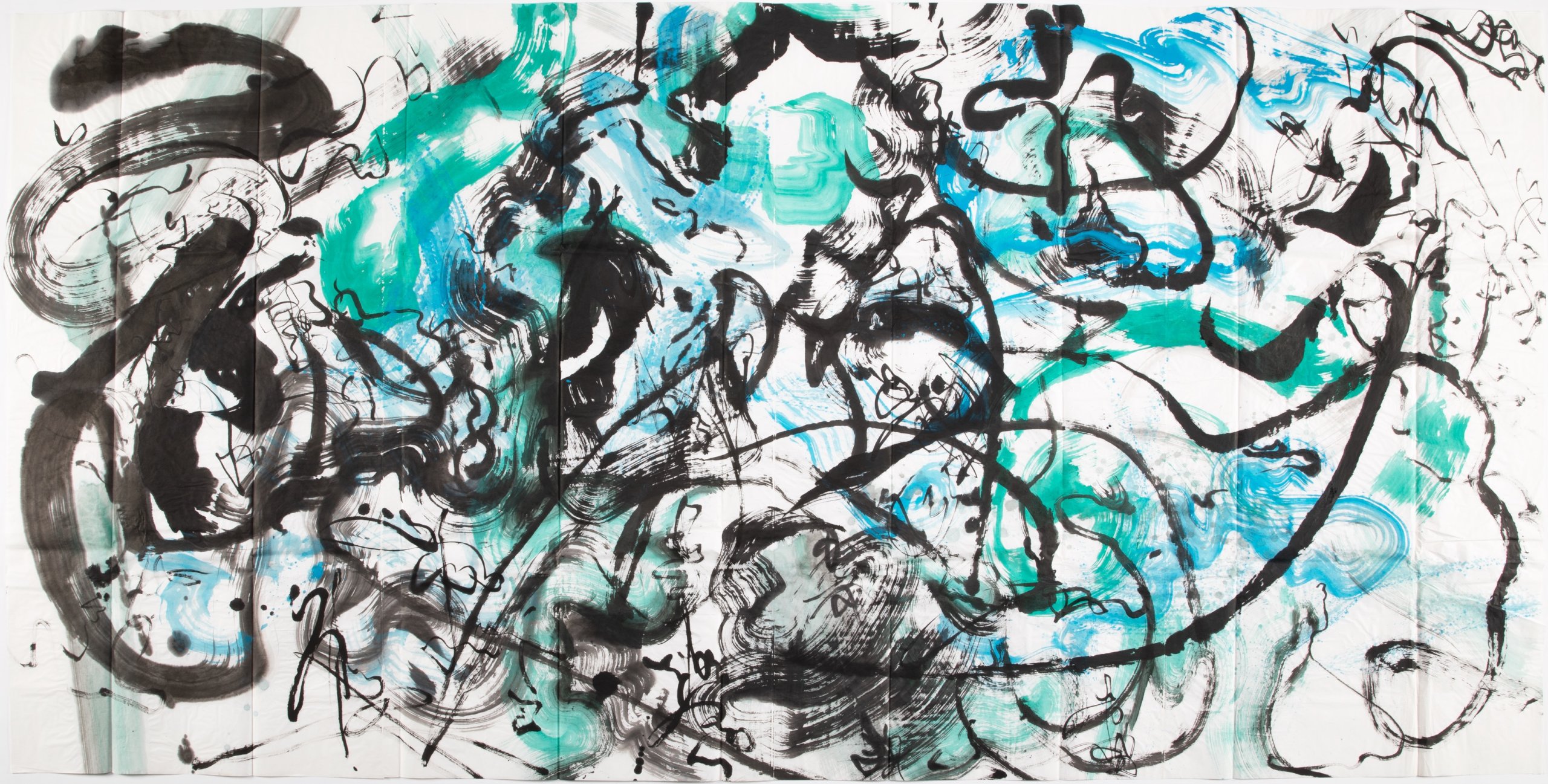本展では縦横無尽、怒涛のような線のうねりが生み出す圧倒的な迫力で迫る作品群が登場。長辺2~3mの特大サイズの絵画も複数展示され、大西が生み出す作品世界に体ごと沈んでいくような感覚を体験することができる。