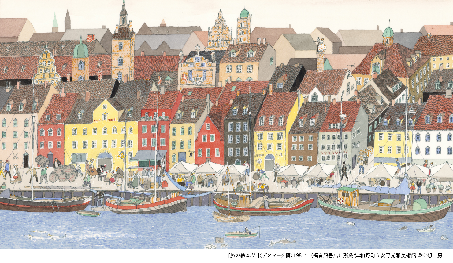 広報担当者は「代表作の絵本原画約130点の展示に加えて、代表作のひとつ『旅の絵本』シリーズから厳選した8つの場面を、弊館の特徴である大きな楕円型の展示室の壁一面に引き伸ばして展示します。緻密に描き込まれた安野さんの絵の世界をぜひ体感してください。また、この絵本はヨーロッパを旅した際に着陸間際の飛行機の窓から見た風景に着想を得て描かれたそうです。会場にも窓がデザインされ、安野さんと同じような視点で風景を楽しむことができます」と見どころを語る。
