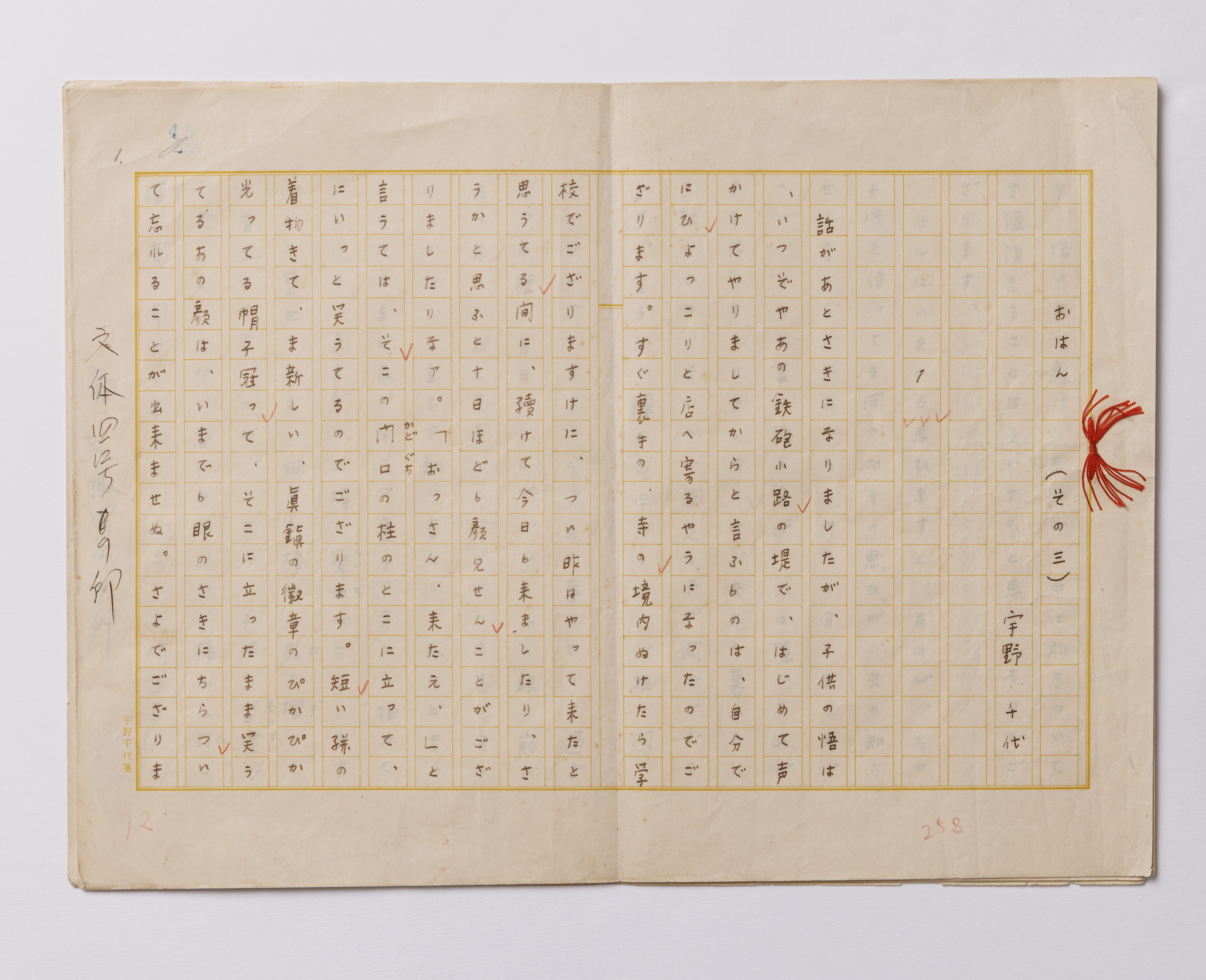 前半では「色ざんげ」の自筆原稿をはじめ、東郷青児が宇野に宛てた書簡、北原との中国旅行で記された日記、宇野が手掛け、日本初のファッション誌として記録的な売り上げを見せた雑誌「スタイル」のほか、宇野のデザインによる旧蔵の着物など、多彩な資料を一堂に展示。『世田谷文学館』の新たなコレクションの核となる資料が総覧される。