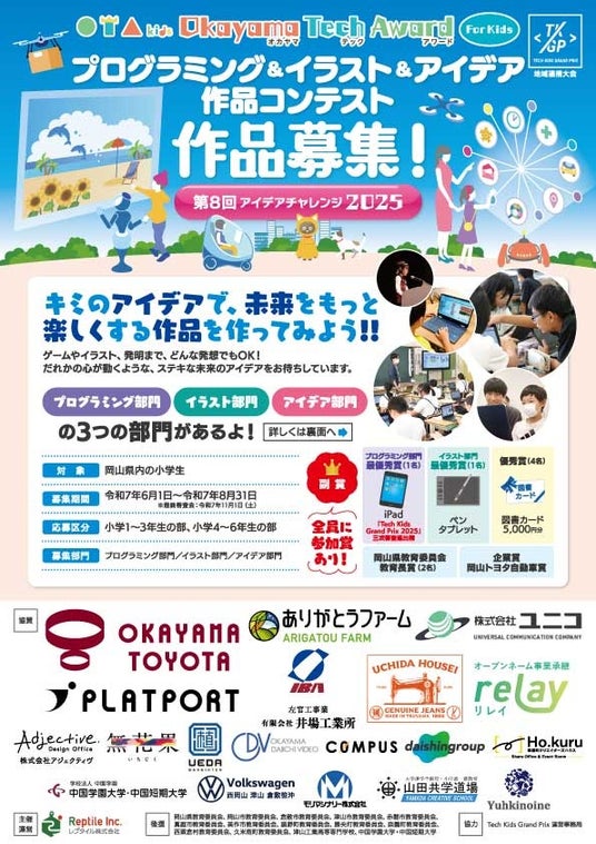 岡山県内の小学生に向けたプログラミング&イラスト&アイデア作品コンテスト。「Tech Kids Grand Prix」と連携。応募は8月31日まで。