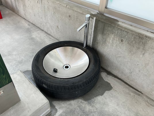 廃タイヤを用いた手洗い場: SDGsへの取り組み。資源を有効活用し、環境負荷を低減。