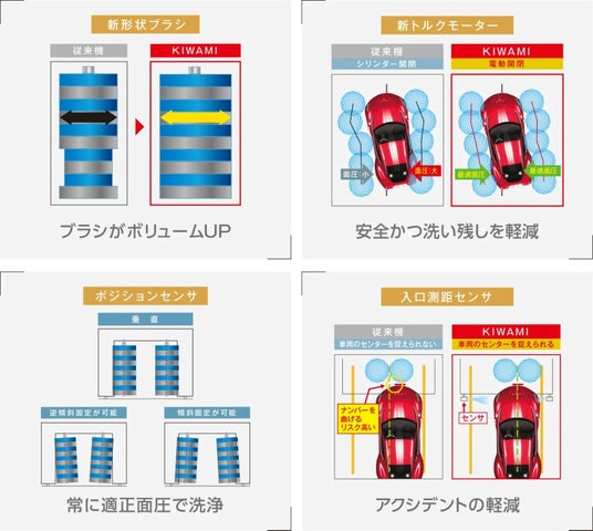 大型ブラシ洗車による洗い残し軽減新ブラシ形状と新トルクモーターによる電動開閉方式の採用により、これまでよりもブラシを細かく自在にコントロールすることが可能となりました。また、ブラシ傾斜位置を正確に確認するポジションセンサーと新制御システムの採用により進入した車両の中心をセンサーが感知して左右均等な洗浄が可能となりました。