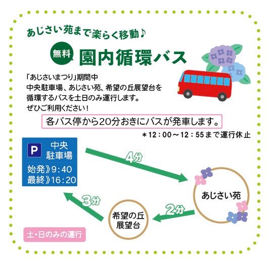 あじさいまつりの期間中(6/7~7/6)の土日には、園内の「中央駐車場」、「あじさい苑」、「希望の丘展望台」を循環するバスを20分おきに運行しています。