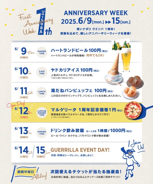 株式会社バルニバービ(本社:大阪市西区、代表取締役会長 佐藤裕久)は、大阪・堺市のピッツェリア「青いナポリウミソバ」にて、オープン1周年を記念し、2025年6月9日(月)から6月15日(日)までの7日間、日替わりで特典が楽しめる1周年感謝フェア「First Anniversary Week」を開催します。