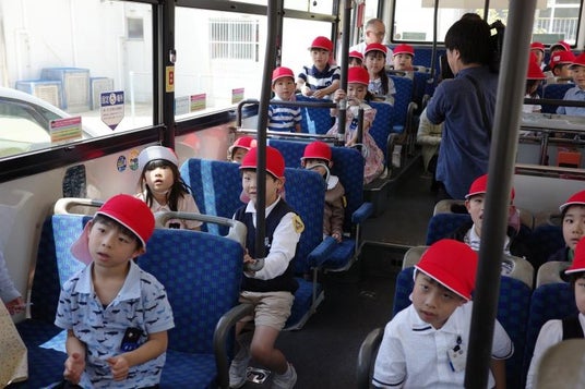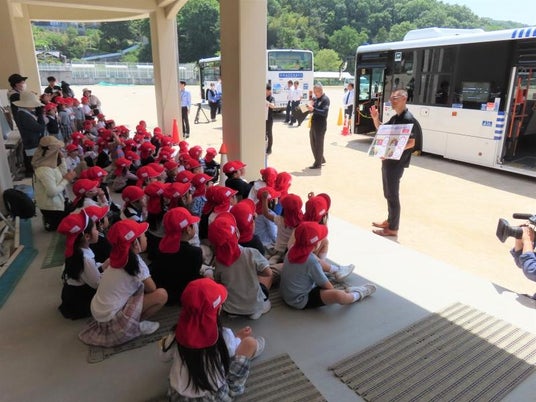 1年生を対象に実施されたバス教室では、岡山市交通政策課の担当者からクイズを交えながら、バスでのマナーや乗り方を教わりました。バス会社の協力により運動場に路線バス3台が持ち込まれ、実際に整理券を取って乗車体験するなど、楽しく快適にバスに乗ることを学びました。