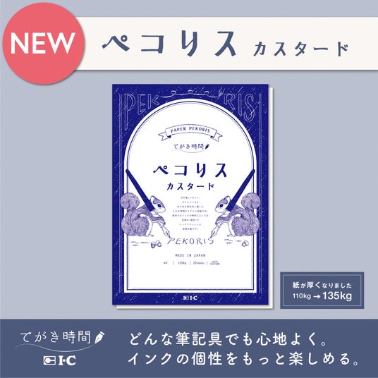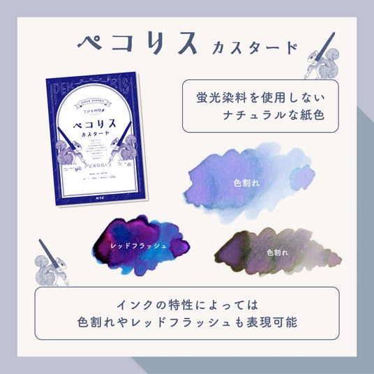 てがき時間 ペコリス カスタードは自社開発したオリジナル用紙であり、一般的な上質紙とは異なり、使用するインクの特性によって「色割れ」や「レッドフラッシュ」と呼ばれるインクの色変化を楽しむことが可能です。「色割れで思わぬ色の変化が出て面白い」、「厚めの紙だからインク多めで書いても大丈夫。インクだまりやにじませた所もすごい綺麗」など、日頃からインクを楽しまれている方から多くのご好評をいただいています。