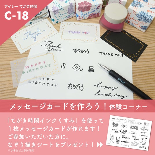 アイシーブースのてがき時間体験コーナーで、てがき時間インクを使用した「メッセージカードを1枚作れる!体験コーナー」を実施します。お好きなメッセージカードを選び、なぞり描きシートを使って自由にメッセージカードを作成してみましょう。