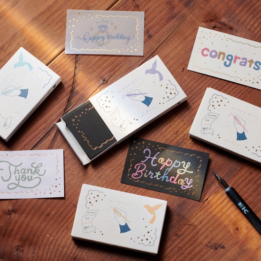 てがき時間インクと相性のよい紙をセレクトしたペーパーシリーズで、シロ、ナチュラル、クロ、トレペの4種類を展開しています。飾り枠が箔押しされた名刺サイズのカードがスライド式のボックスに入っており、メッセージカードなどにも最適です。