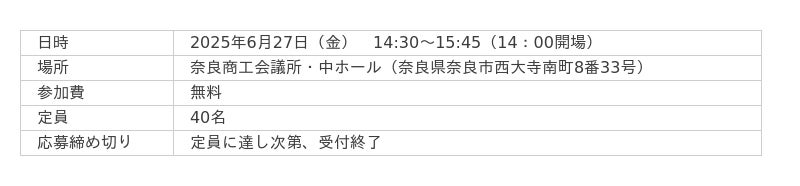 奈良新聞社(本社:奈良市法華寺町2番地4、田中篤則代表取締役社長)は、奈良県の中小企業の事業承継や成長戦略をテーマにしたセミナー講演を6月27日(金)に開催します。
