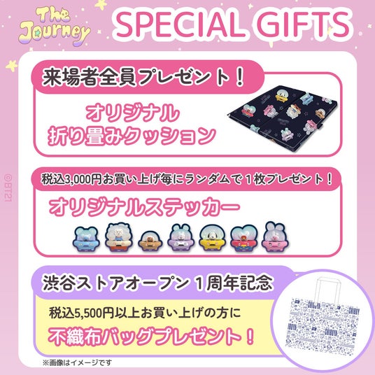 上映会をメインに、「The Journey」シリーズをはじめとする新商品の販売や、限定デザインのレシート写真機(無料)、BT21のみんなとのグリーティング、来場者全員への特別プレゼントやSNSキャンペーンなど、ファンに楽しんでもらえる様々なコンテンツを用意しております。