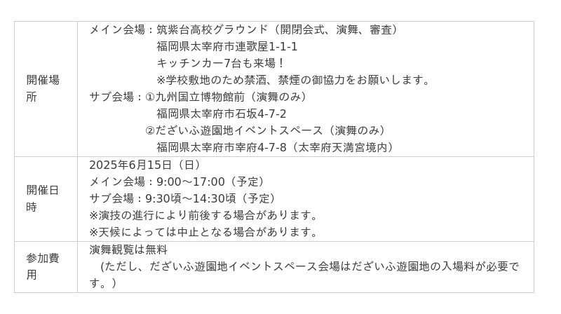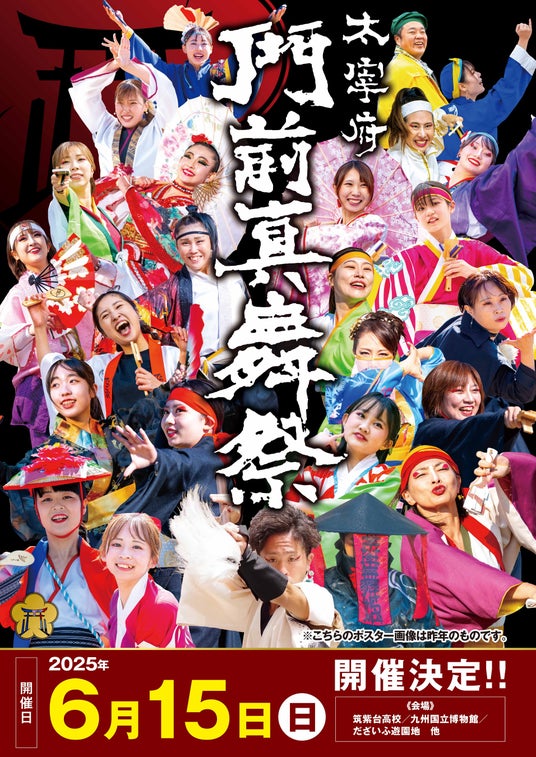 (一社)太宰府観光協会(福岡県太宰府市、不老安正会長)と太宰府まほろば衆(福岡県筑紫野市、相川茂代表)は、第19回太宰府門前真舞祭を開催します。参加者を5つのブロックに分け、曲、踊り、衣装、表情、感動の5項目を審査し、各ブロックの大賞、準大賞、優秀賞を競うコンテスト形式のイベントです。今回はメイン会場を筑紫台高校に移し、これまでよりもゆったりとした観覧スペース、キッチンカー7台によるグルメもお楽しみいただけるよう、観覧のお客様もお楽しみいただける環境に配慮しました。全国のダンスパフォーマンス団体に演舞披露の場を提供するとともに、太宰府への観光客の誘客促進、また観光客の皆様にダンスの素晴らしさを体感いただくことを目的としています。