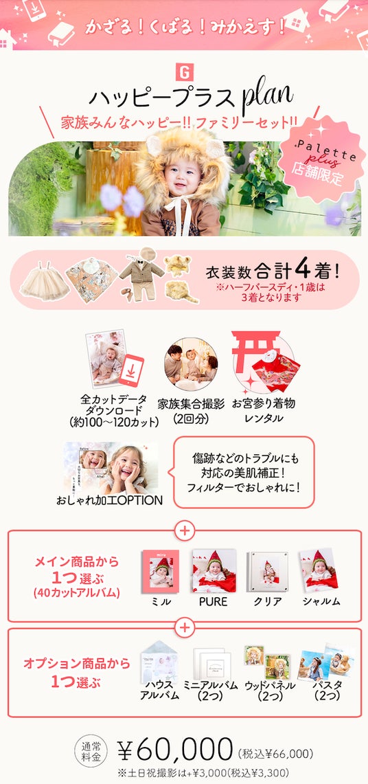かざる、くばる、みかえす。年間1万組以上のベビー&キッズのご記念をお祝いしてきたPalette+plusのスタッフが本気で考えた、魅力をぎゅぎゅっと詰め込んだ「ハッピープラスプラン」が新登場。