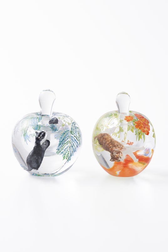 秋葉 絢氏は、日常で感じるささやかな幸せを、まるで宝物を集めるように、コアガラスやバーナーワークの技法でかたちに表していきます。