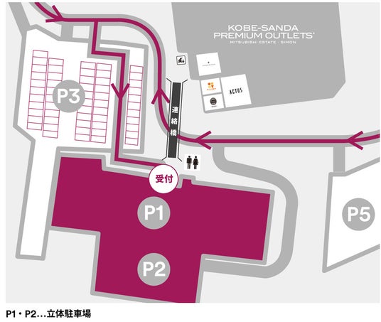 神戸三田プレミアム・アウトレットの専用看板を目印に、バレーパーキングサービス専用車寄せ(P1立体駐車場エレベーターホール前)までご来場ください。