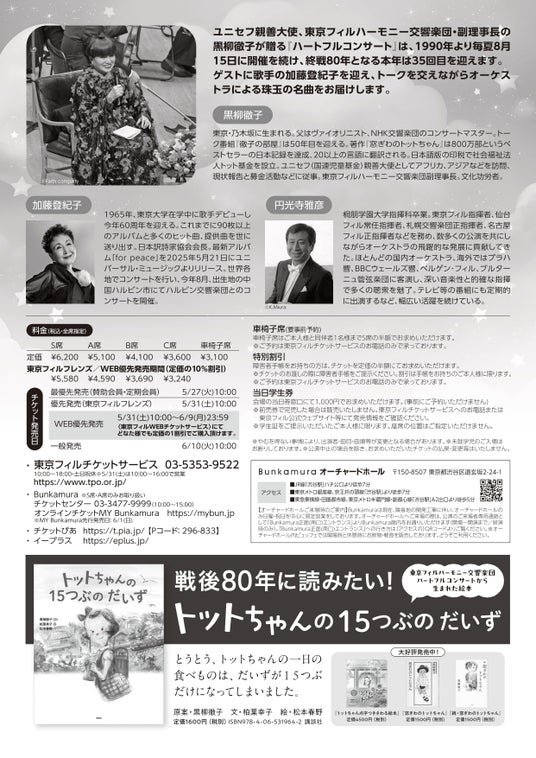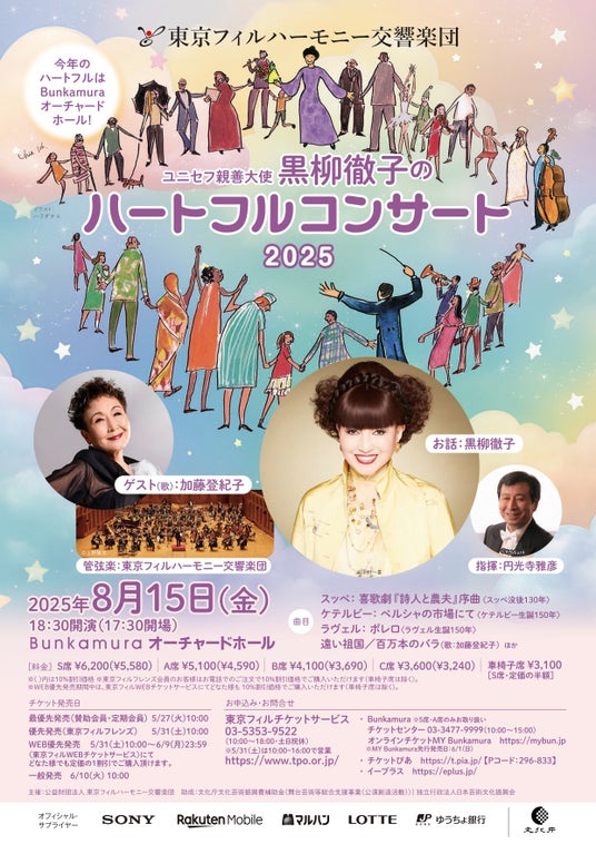 公益財団法人東京フィルハーモニー交響楽団(以下、東京フィル/所在地:東京都新宿区、理事長:三木谷浩史)では、2025年8月15日(金)に東京フィル副理事長である女優・ユニセフ親善大使の⿊柳徹子との「ハートフルコンサート」を開催します。