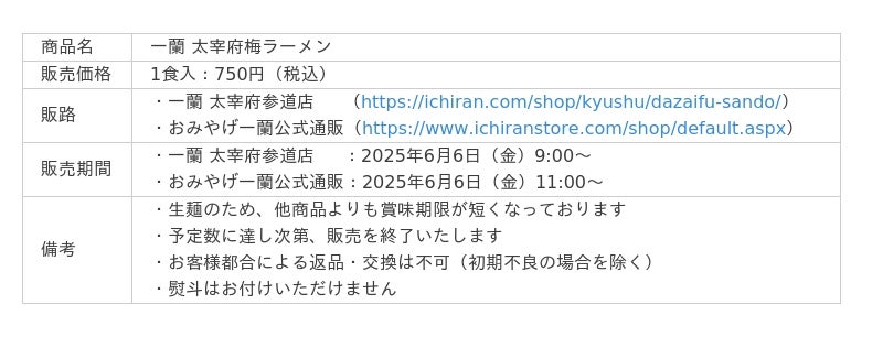 株式会社一蘭は、「梅の日」である本日6月6日(金)より「一蘭 太宰府梅ラーメン」を数量限定で販売いたします。