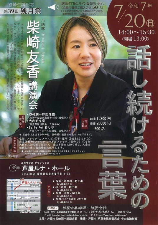 谷崎潤一郎(1886~1965年)の生誕を記念した「残月祭」。今年は、2024年に『続きと始まり』で谷崎潤一郎賞を受賞した柴崎友香さんをゲストに迎え、谷崎の魅力と関西の文化、風土について思いをめぐらせながら、文学や自身の創作活動を語っていただきます。著書に、『春の庭』(芥川賞受賞)、『その街の今は』(咲くやこの花賞受賞)、『寝ても覚めても』(野間文芸新人賞受賞/映画化)、近著に『遠くまで歩く』など多数。