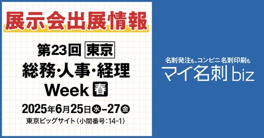 株式会社サムライソード(本社:東京都豊島区、代表取締役:比企 良公)は、法人向け名刺発注クラウド『マイ名刺 biz』を、2025年6月25日(水)から開催される「総務・人事・経理Week【春】」(主催:RX Japan株式会社、会場:東京ビッグサイト)に出展いたします(小間番号:14-1)。