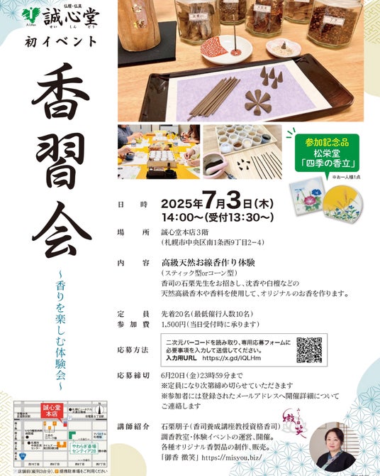株式会社あいプラン(北海道札幌市)の仏壇・仏具を取り扱う誠心堂は、2025年7月3日(木)に誠心堂本店にて、初の体験型イベント「香習会(こうしゅうかい)~香りを楽しむ体験会~」を開催いたします。