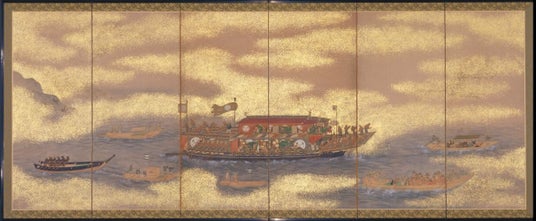 (5)【ユネスコ「世界の記憶」登録品】 朝鮮通信使御楼船図屏風 江戸時代 大阪歴史博物館蔵(辛基秀(シンギス)コレクション) 国際交流の玄関口・大阪は、江戸時代には幕府直轄都市として、正式な外交使節である朝鮮通信使を迎えました。一行は都市の賑わいや彼らを乗せて淀川を進む豪華絢爛な川御座船に強い印象を受けたと書き遺しています。本図は一行のうち従事官を乗せた中土佐丸です。当館所蔵の朝鮮通信使資料は生涯を通信使研究に捧げた辛基秀氏の収集品で、隣国同士の友好関係を示す貴重な歴史資料として世界史的にも注目される資料です。