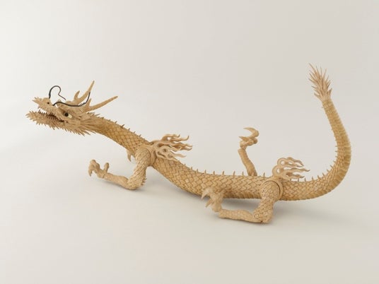 (3)龍自在置物 穐山竹林斎(あきやま ちくりんさい)作 大正12年(1923) 大阪歴史博物館蔵(西條敏弘氏寄贈)穐山竹林斎(1891~1937)は大阪・粉浜(こはま)の彫刻家です。自在置物とは、龍や海老などの関節を自在に動かせる細工を施した工芸品です。堅牢な金属で作られているのと違い、同じ動きを木製品で実現するには構造上の工夫が必要でしたが、竹林斎は金属のワイヤーを内部に仕込む創意工夫によりこの難題を解決しました。竹林斎の優れた彫刻技術に大阪人らしい柔軟な工夫が加えられることで芸術に昇華された逸品です。