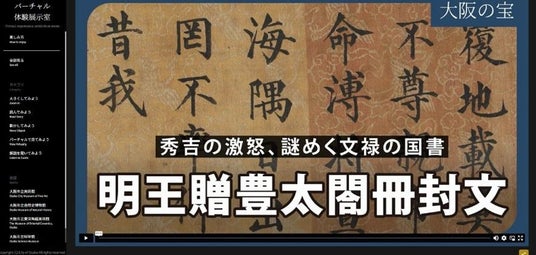 本資料は文禄5年(1596)、「文禄の役」の講和交渉に際し、明(中国)皇帝から豊臣秀吉に贈られた国書です。「大阪の宝バーチャル体験展示室」では、資料を見ながら現代語訳の朗読を聴くことができます。