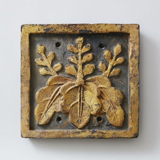 (1)【大阪市指定文化財】 金箔桐文方形飾瓦 豊臣時代(16世紀末) 大阪歴史博物館保管 五七桐文に金箔をほどこした飾り瓦です。昭和46年(1971)に中央区森の宮遺跡の発掘調査で出土しました。出土した場所はJR森ノ宮駅の西側にあたり、大坂城内に存在した武家屋敷の跡地と考えられています。豊臣政権に従った全国の大名は大坂城内やその周辺に屋敷を設け、その屋根はきらびやかな金箔瓦で飾られていました。桐の文様は豊臣氏ゆかりのもので、屋敷の主が豊臣政権と深いつながりを持つことを示しています。豊臣時代に形作られた城下町が、現代の都市大阪の基礎となりました。