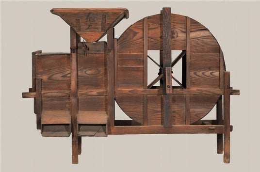 (2)京屋唐箕(とうみ) 嘉永4年(1851) 大阪歴史博物館蔵(平野区画整理記念館寄贈)唐箕は風力によって穀物と塵芥(じんかい)を選別する農具で、本資料は大阪市平野区平野上町で使用されていたものです。「大坂農人橋 京屋七兵衛」「嘉永四年」の墨書があり、大坂農人橋(中央区)の農具商・京屋製とわかります。京屋の唐箕は西日本で用いられた唐箕の基本形と考えられ、近畿を中心に多く残っていますが、嘉永期の紀年銘をもつものは現状で唯一です。大坂の農具職人の技術力が農業に革新をもたらし、各地の風土を育みました。