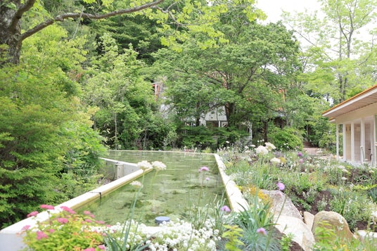 中央に位置する「セラの池」を、木々と花々が囲むガーデン「おとぎの庭」です。ミュージアムを覆う森の木々はレストランのオーナーが当時植えられたもので、できるだけその木々を活かしています。