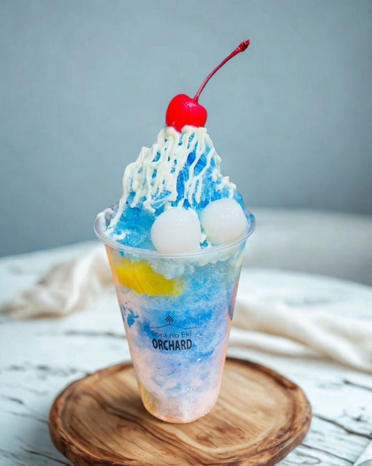 店名のように青空のように爽やかなブルーカラーが夏らしさ満点のオーチャード特製かき氷です。