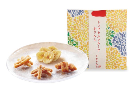 季節限定商品「トロピカルフルーツかりんと」パイナップル、マンゴー、ココナッツかりんとにバナナチップの4種をミックスした、南国の夏を感じるフルーツの風味と香りがフワッと広がる夏季限定商品。