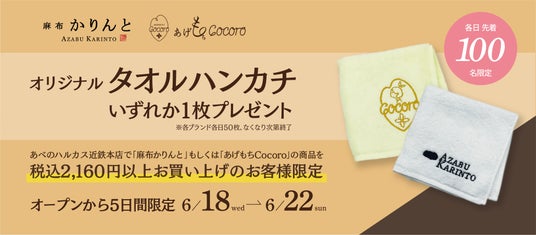 「麻布かりんと」「あげもちCocoro」のロゴを刺繍したオリジナルタオルハンカチをプレゼントいたします
