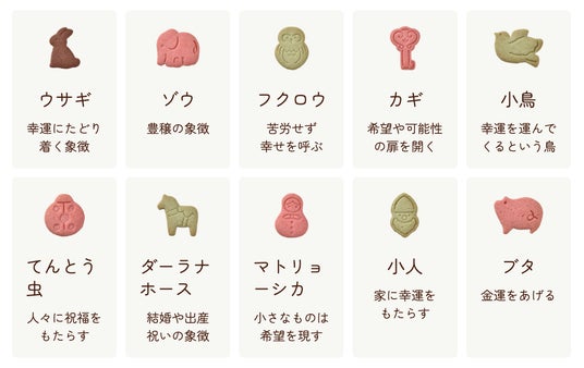 手に取った方々に「幸福」が訪れるように願いを込めて、世界中のラッキーチャームをちりばめています。10種類のラッキーチャームをかたどった米粉クッキーのしあわせな味わいをお楽しみください。