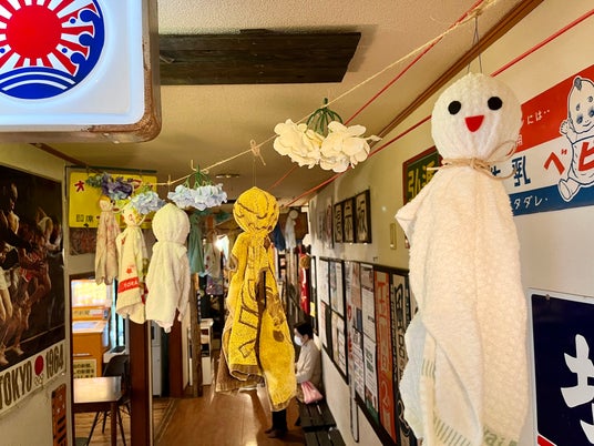 関東地方梅雨入りのニュースを受けて、昭和レトロな温泉銭湯 玉川温泉、秩父湯元 武甲温泉、おふろcafe 白寿の湯で「忘れ物タオルのてるてる坊主」の装飾を開始しました