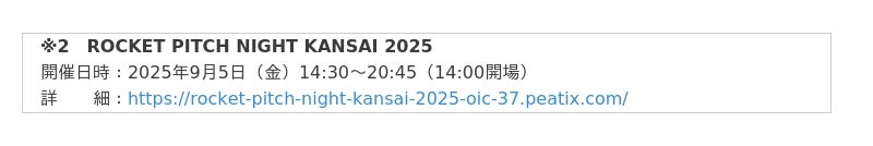 またワークショップの最後に行われるピッチ発表会で選出された参加者は、2025年9月5日(金)に開催される日本最大級のピッチイベント「ROCKET PITCH NIGHT KANSAI 2025(※2)」への登壇の機会を得ることができます。
