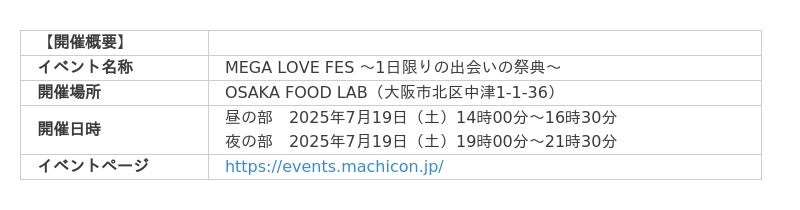 株式会社リンクバル(本社:東京都中央区、代表取締役社長:吉弘和正、証券コード:6046、以下「リンクバル」)が運営するイベントECサイト「machicon JAPAN」は、2025年7月19日に大阪府の「OSAKA FOOD LAB」にて800名規模(昼と夜の各部400名)で開催される【MEGA LOVE FES、以下「本イベント」】の掲載およびチケット販売を開始いたしました。