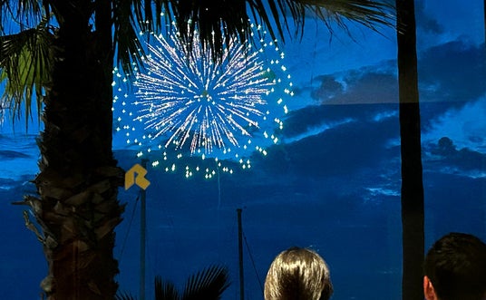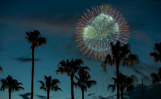 絶景サンセットタイムに、マリブファームの人気メニューをビュッフェ料理で堪能。ヤシ並木と花火のコラボレーションが望めます。