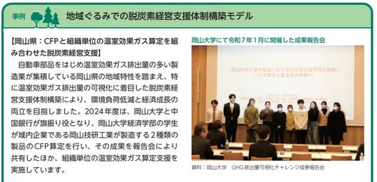 同白書では、2024年度に本学と株式会社中国銀行が中心となり、経済学部の学生が、域内企業である岡山技研工業株式会社の2製品についてカーボンフットプリント(CFP)の算定を行ったこと、その成果を報告会を通じて地域で共有したこと、さらに組織単位での温室効果ガス排出量算定支援を進めたことが紹介されています。